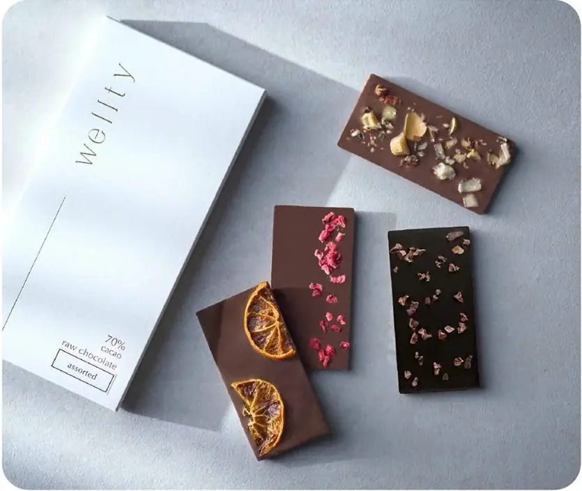 商品例:wellty raw chocolate〈ミニ アソートセット〉(4枚入り)3,501円(販売予定数120)、やすらぎの羊(1個)各864円(阪神梅田本店先行販売、販売予定数各50)。白砂糖・乳製品・乳化剤不使用のローチョコレートで、売上の一部をエシカルな取り組みへ寄付するなど、環境や生産者に配慮したブランドです。