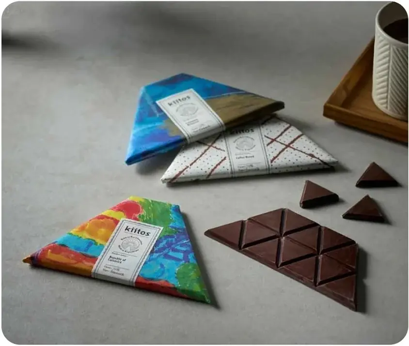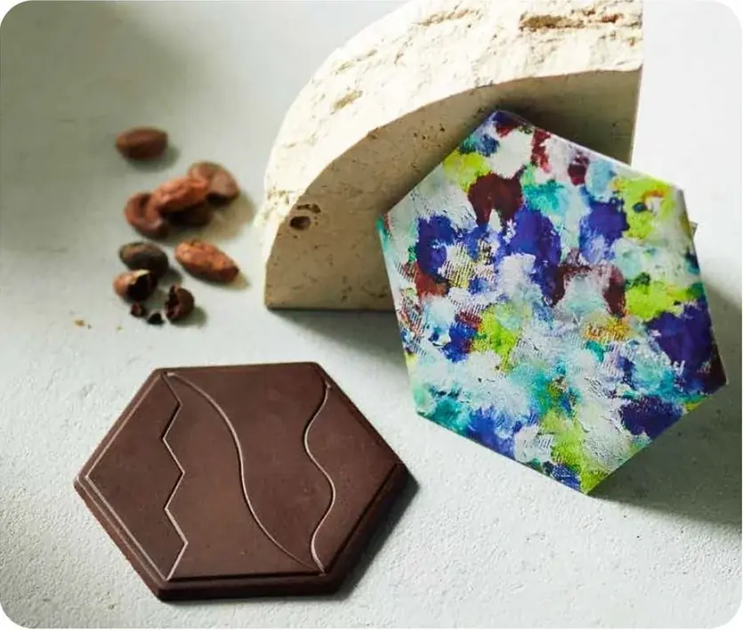 商品例:タンザニアクランチ(40g)1,404円。リブランディングにより誕生したブランドで、手仕事感を残したざくざくとした食感と、ぶどうジュースを思わせるフルーティな香りが特徴です。包み紙には多様なアーティストの表現が施され、物語性を持たせています。