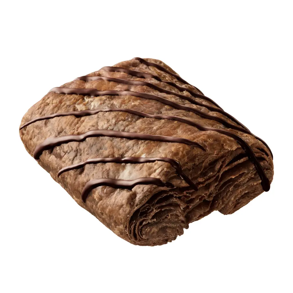 「ドゥショコラパイ」はデニッシュのようなサクサクとした食感を持つショコラパイ生地を新たに開発し、2種のショコラクリームを重ねて包み込んで焼き上げた商品です。外側はビターな味わい、内部には重ねられたショコラクリームが濃厚さをもたらします。