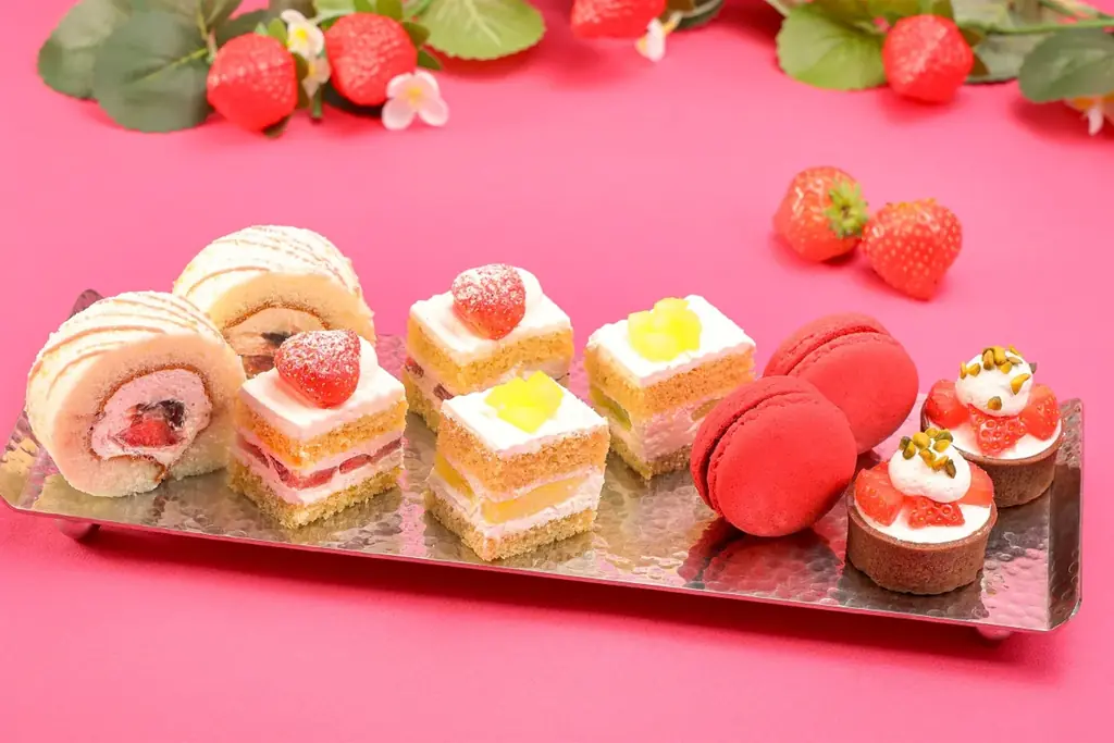 ティースタンドは上段・中段・下段の3段構成で、上段にはニューオータニの誇る「スーパーシリーズ」から2種類が並びます。具体的には糖度14度以上の静岡県産マスクメロンを使用した「スーパーメロンショートケーキ」と、食べ頃の博多あまおうを用いた「新スーパーあまおうショートケーキ」です。いちごづくしを打ち出しつつも、ホテルの代表作を一度に味わえる点が本セットの特色です。