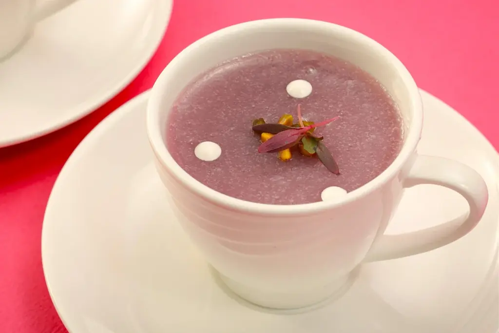 ティースタンド以外にも、サラダやスープ、軽いフライドポテト、さらにデザートとしてのパフェやショコラプレートが用意されています。具体的には「蒸し鶏と根菜チップのパリパリサラダ」や「紫芋のポタージュ」がラインナップに含まれており、食感や温度差を活かした構成が取られています。