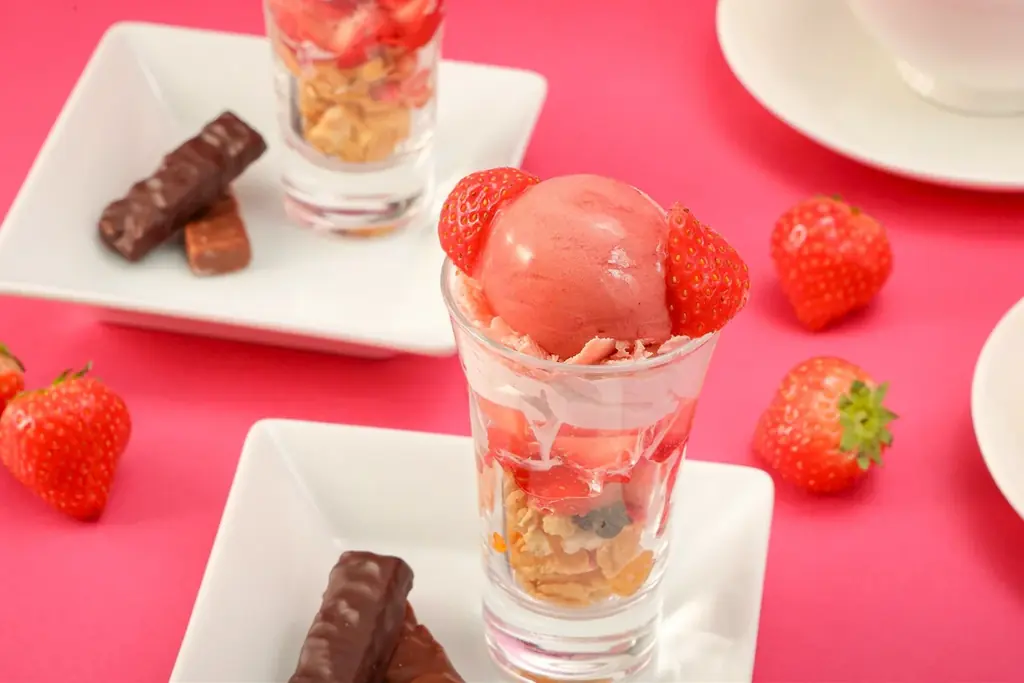 中段はグラススイーツや焼き菓子、スコーンなどを揃え、テクスチャーと味の変化を演出します。いちごの果汁や果肉を活かした冷菓が中心です。