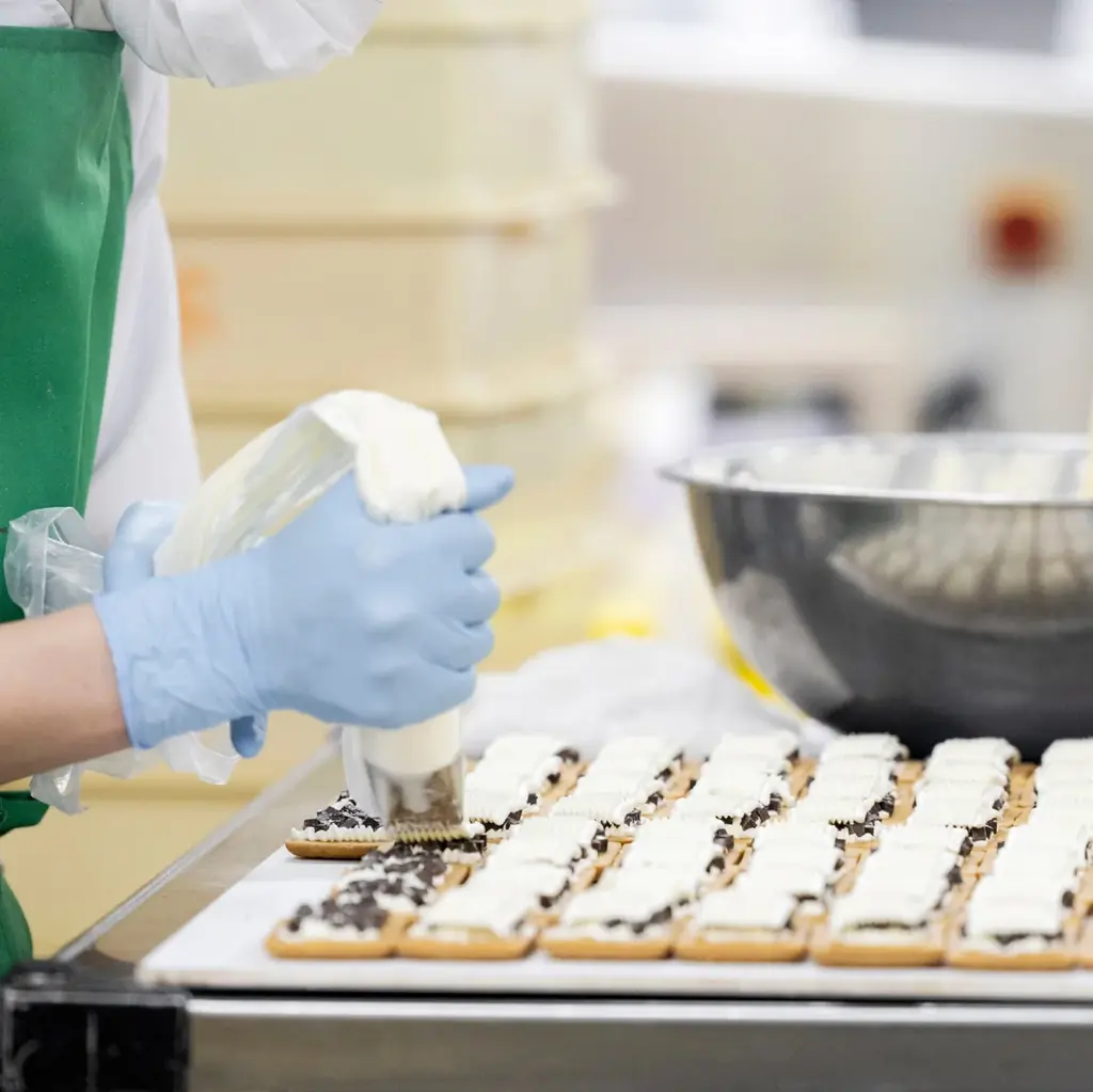 『鎌倉ウィッチ』は平均して1日あたり10,000~11,000個を生産し、鎌倉ビスケに換算すると1日で20,000枚以上を焼成しています。卵塗りやアーモンドを乗せる作業、レーズンのサンドは人の手で行われ、長年の経験を持つスタッフが手作業で仕上げています。