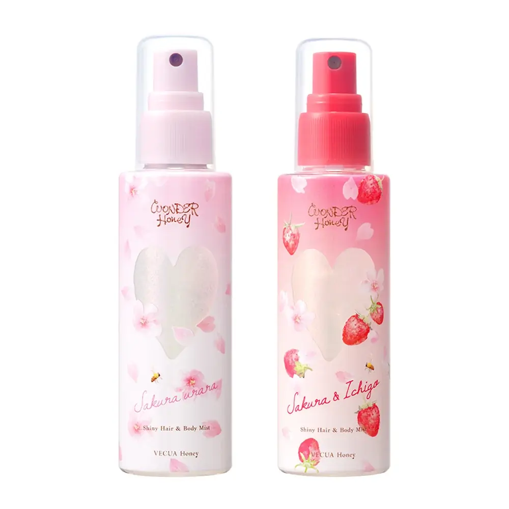 - VECUA Honey ワンダーハニー きらめきヘア&ボディフレグランスミスト:サクラウララ / 野イチゴサクラ、各1,650円。微粒子パールが肌や髪を上品に輝かせるフレグランスミスト。香りは定番の「サクラウララ」と甘酸っぱい「サクラ×野イチゴ」の2種展開。