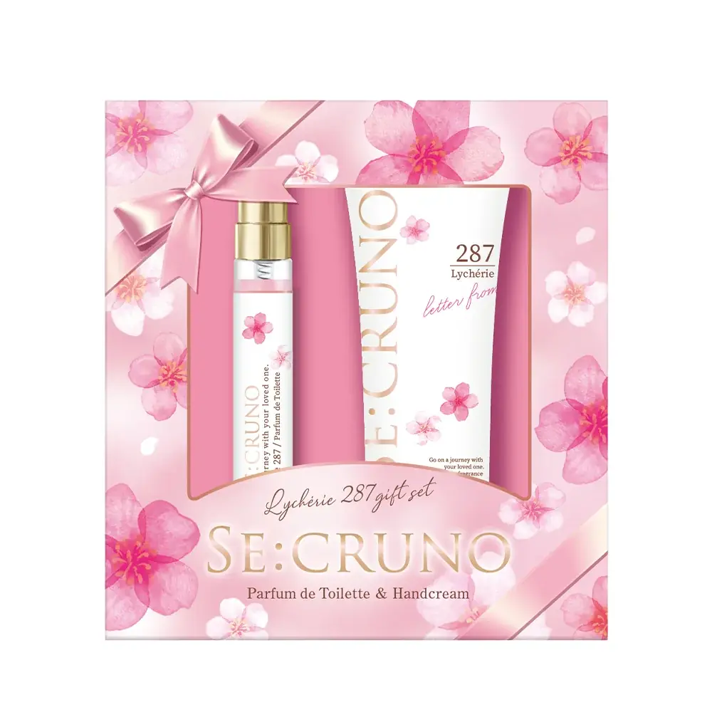 - SE:CRUNO リシェリー287 ギフトセット:価格2,310円。みずみずしいライチとサクラが重なる「サクラ×ライチ」の香りを楽しめる限定ボックス。パフュームドトワレとハンドクリームがセットになったギフト仕様。