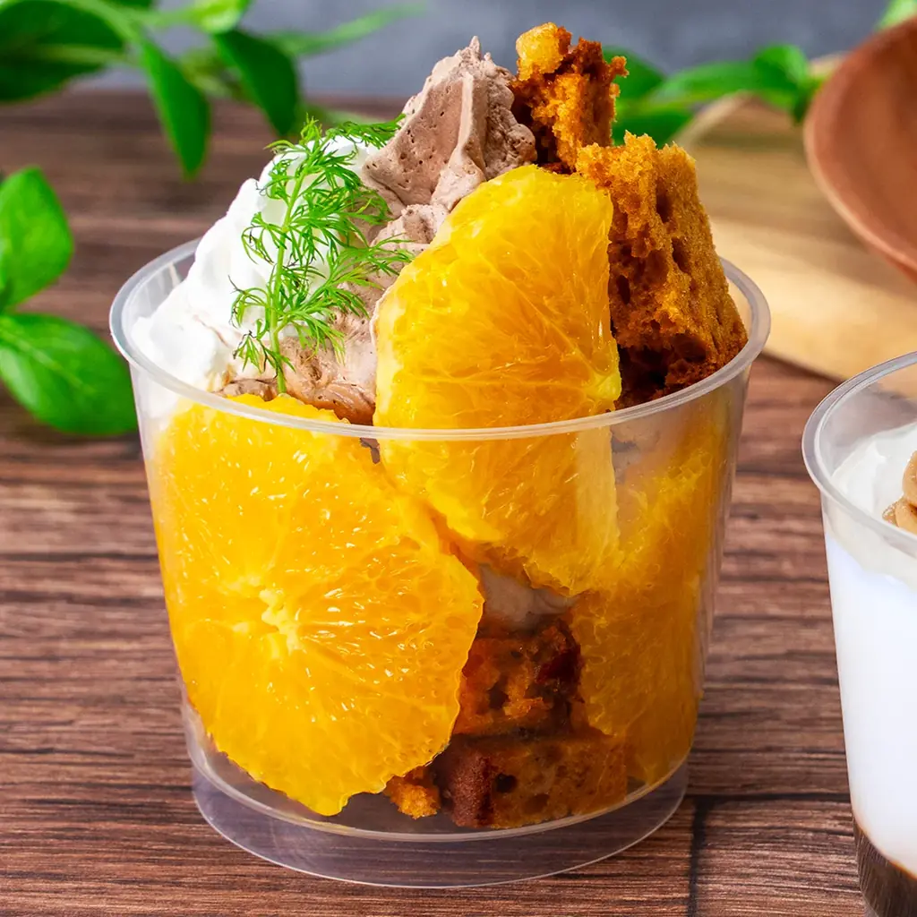 『エコPAO PP 88-270 ウィロー』は、口径88mm/高さ69mmの逆勾配で、容量270ccのゆったりしたフォルムが特徴です。カップ側面にフルーツを並べたり、モンブランの絞りやトッピングの高さを活かした演出が可能です。軽量で作業効率に配慮した形状は、大量生産やテイクアウト用途にも向いています。