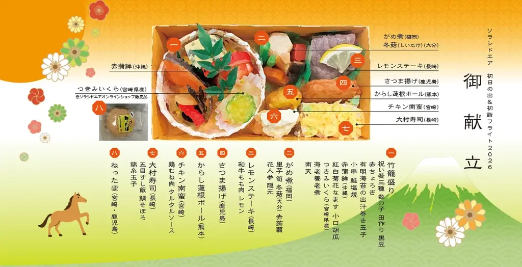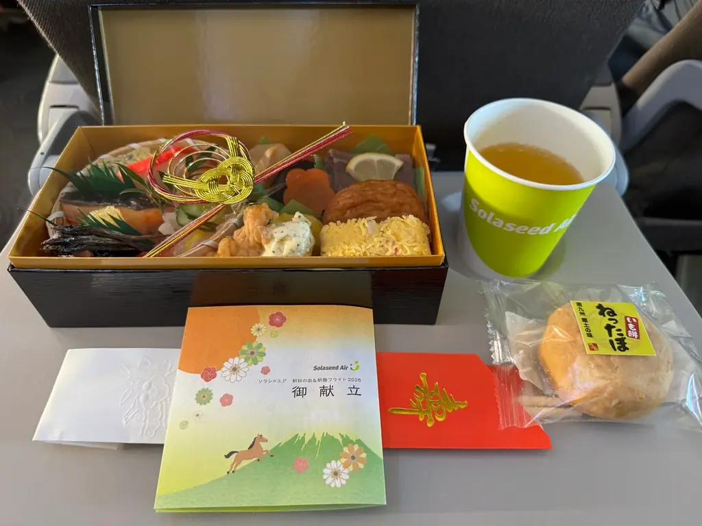 | 機内プログラム | 高度約5,180mからの富士山と初日の出鑑賞、九州・沖縄食材のおせち提供、都農ワイン(キャンベルアーリー・ドライ ロゼ)提供、オリジナルグッズくじ |