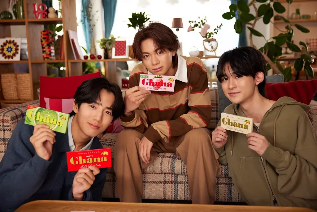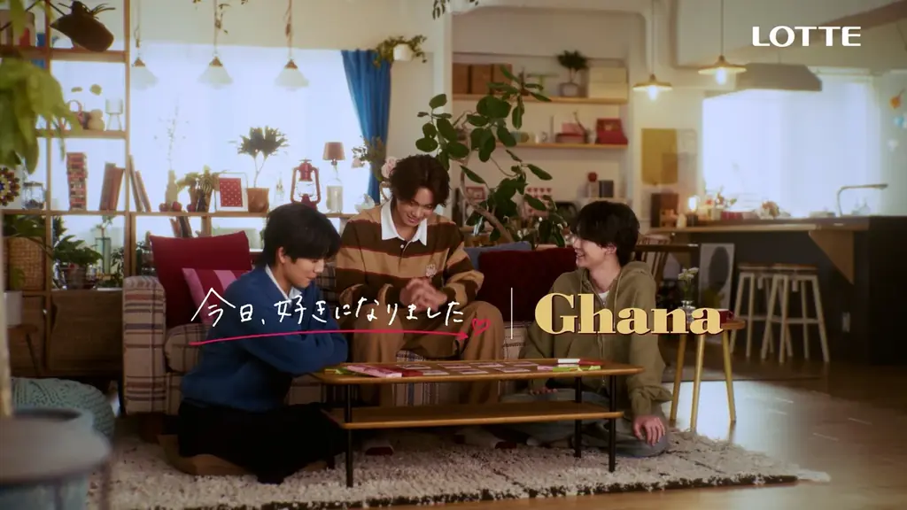 新WEBCM『チーム溺愛彼氏のバレンタイン大作戦』は、溺愛する彼女のために初めて手作りチョコに挑戦する男性たちの奮闘を軸に構成されています。三人はガーナのカラフルな板チョコを前にレシピを相談し、エプロン姿で湯煎から始まるチョコ作りに取り組みます。