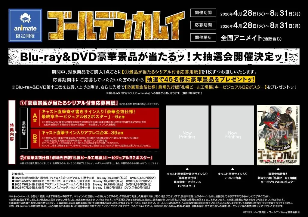 また、Blu-ray&DVD第13巻を購入した先着来店者には〈豪華金箔仕様 劇場先行版「札幌ビール工場編」キービジュアルB2ポスター〉を配布します。ポスター終了時は応募用紙のみの配布となります。