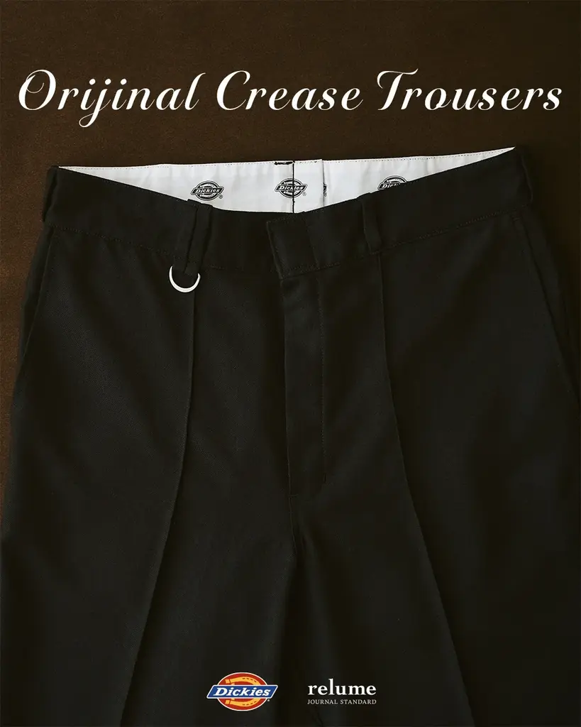 今回の別注は、1980年代にrelumeが別注したDickiesのモデルを継承しつつ現代的な解釈を加え、ワークウェアとスラックスの中間に位置する“大人向け”の一本を具現化しています。