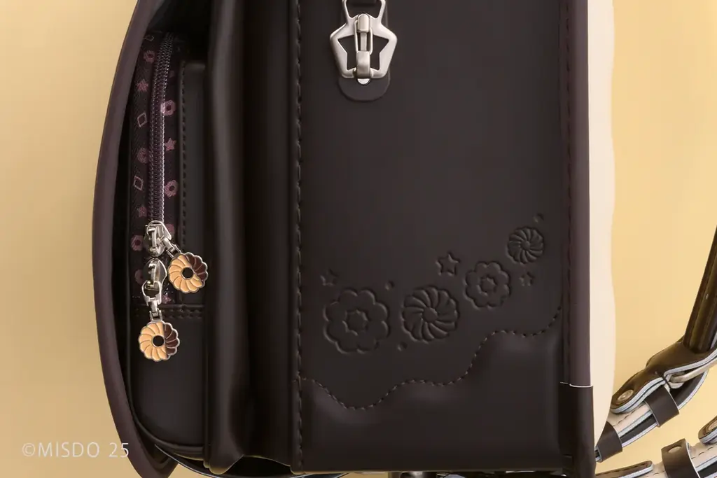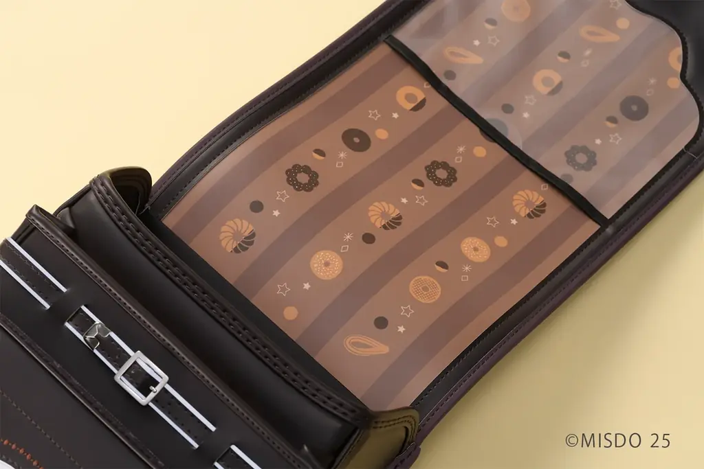 コラボランドセルは、ミスタードーナツのドーナツやカラーをモチーフにした意匠が随所に施されています。内装や前ポケットなどにドーナツのモチーフを取り入れつつ、全体はランドセルとして日常使いしやすい落ち着いた仕立てにまとめられています。