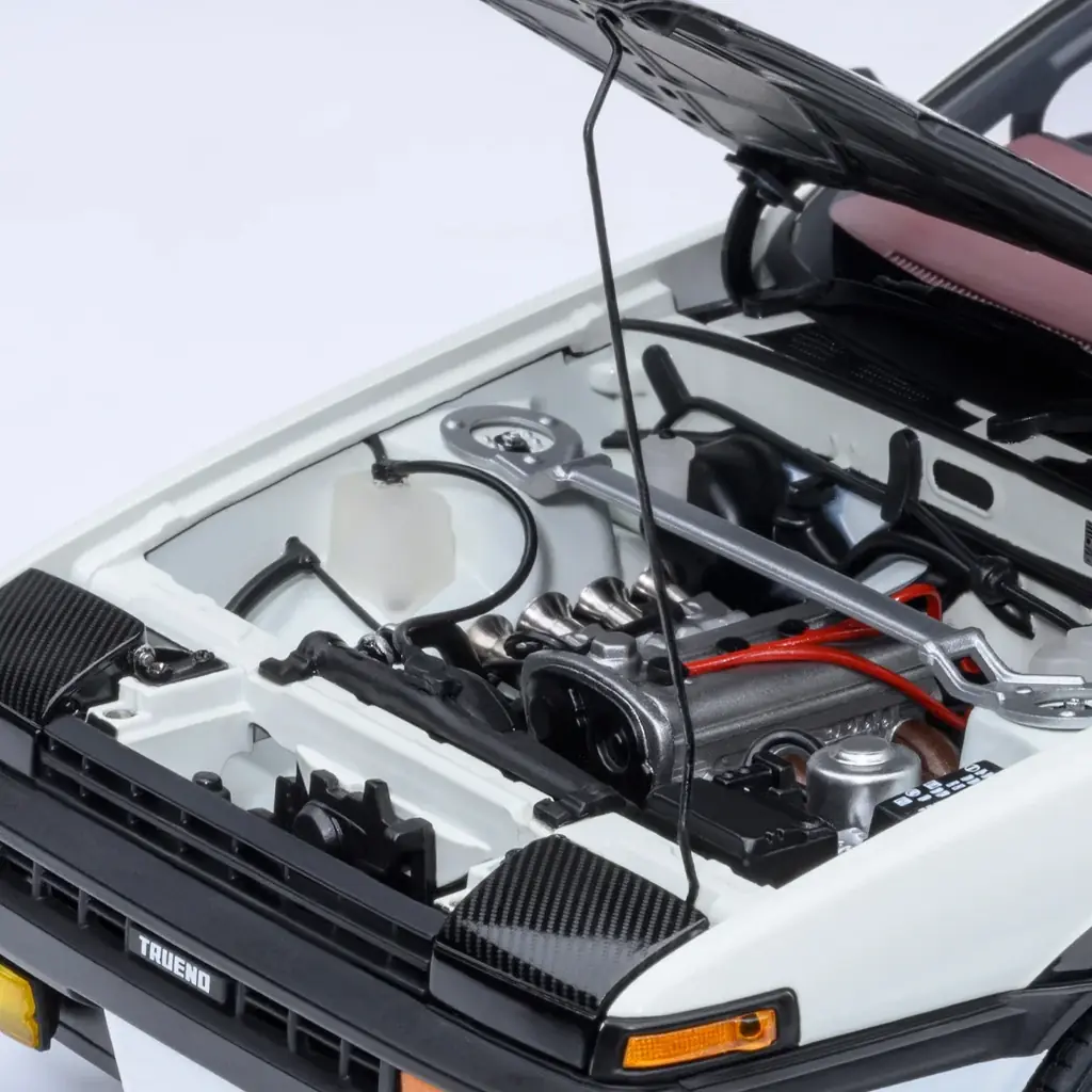 本モデルは講談社公認の『頭文字D』ライセンス取得商品として展開され、作品ファンのみならずミニカーコレクターに向けた高いコレクション性を備えます。製造はAUTOart(オートアート)で、実車の造形を忠実に再現するために3Dスキャニングを用い、シャープなボディラインと剛性感のある開閉機構を実現しています。