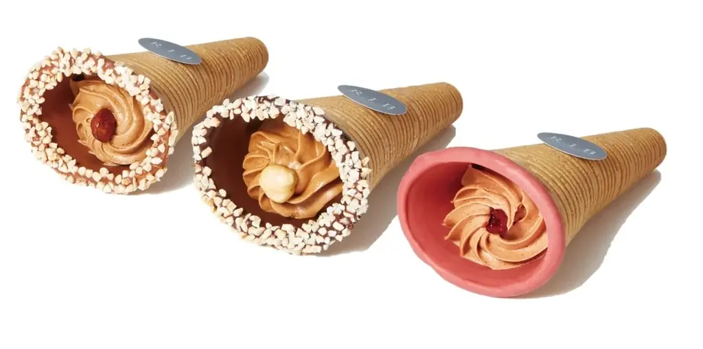 - エッフェル塔をイメージしたコーンの中にミルク、スイート、ベリーのホイップクリームをそれぞれ封入。アーモンドの香りとチョコ感が広がる。価格:3個入 2,592円。