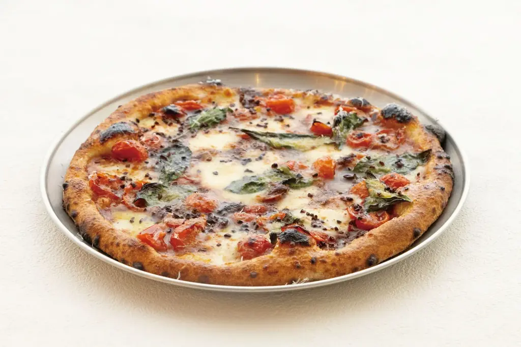 - 〈カカオハンターズ〉のトゥマコのカカオニブを使ったピクルス液で漬けたミニトマト、砕いたトゥマコのチョコ、バジル、モッツァレラ、グラナパダーノをのせたピザ。価格:1皿 3,520円【東京限定】。