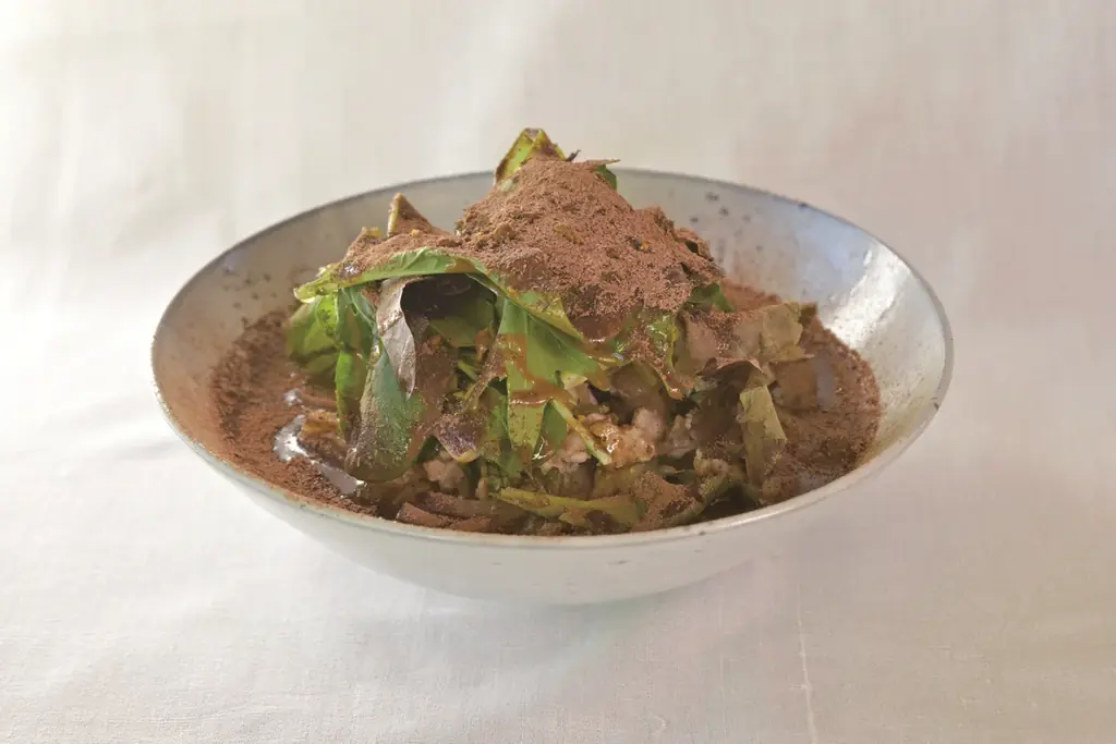 - 鶏のスープにココナッツミルクを加え、国産牛・豚の煮込みやナッツをトッピング。仕上げにカカオペーストを削りかけ、スープにカカオが溶け出してコクが増す。価格:1人前 2,970円【東京限定】。