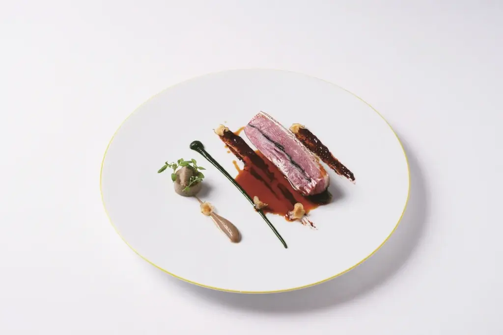 - 京都・七谷鴨の胸肉にトリュフを挟み、皮は香ばしく中はロゼに焼き上げた一皿。カカオニブの苦みと濃厚なソースが調和。出店期間:1月31日(土)~2月4日(水)。価格:1皿 4,950円【東京限定】。