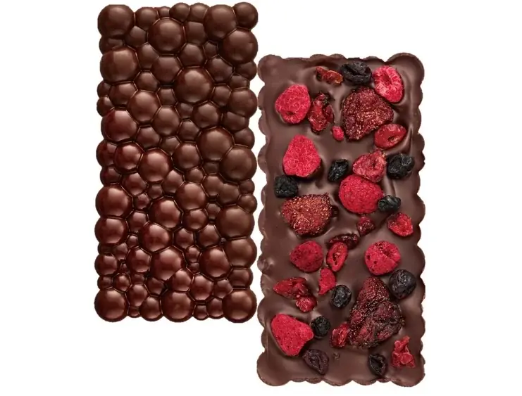 - 72%ノワールの中にフランボワーズの種入りパートドフリュイを閉じ込め、ドライミックスベリーを散らした香り豊かな贅沢タブレット。価格:1枚 2,700円【東京限定】。