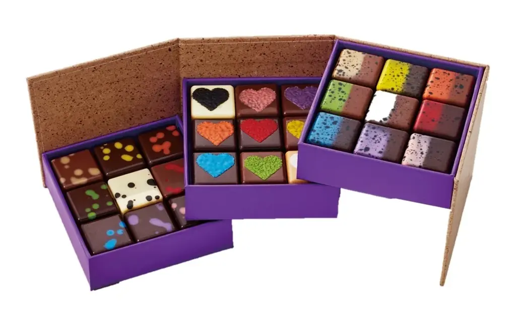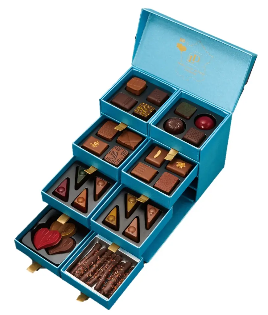 - 2026年おすすめガナッシュ9種、プラリネ9種、2層のビークーシュ9種を詰めた豪華な3段BOX。27個入。価格:10,800円。