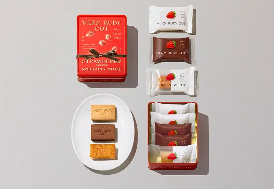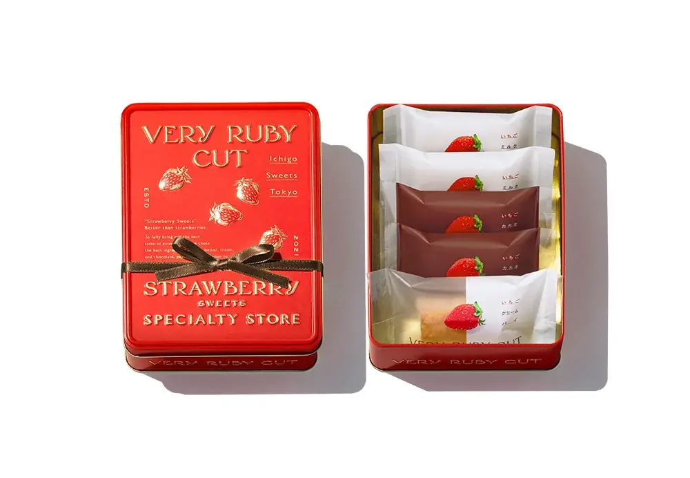 外装はブランドカラーであるいちご色を基調とした真っ赤なアソート缶で、エンボス加工されたいちごのデザインが施されています。チョコレート色のリボンが結ばれた見た目は、贈る相手にとって視覚的なときめきを演出します。