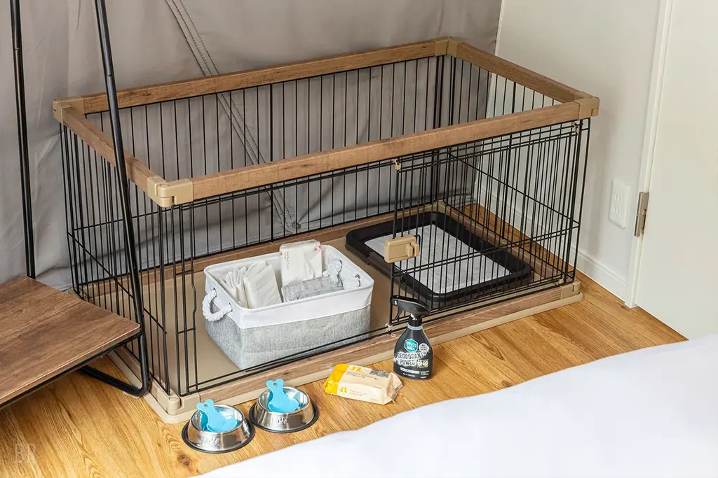 愛犬用アメニティが充実しており、初めての宿泊でも安心して利用できる構成です。用意されるアメニティはケージ、トイレシート、オムツ、エチケット袋、ウェットティッシュ、除菌消臭スプレー、粘着ローラー、食器などです。