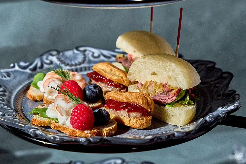 中段に含まれる具体的な品目は次の通りです:海老とベリーのカナッペ(フロマージュブランのムース)、ポークリエットのプチエクレア(黒胡椒香るストロベリージャム)、いちごローストビーフサンド(マスタード風味)。