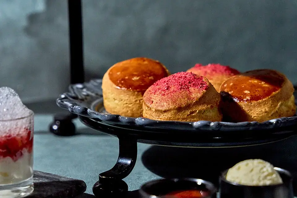 下段はスコーンが中心で、苺風味を生地に封じ込めた「いちごスコーン」と、ゲランド塩を用いたスコーンを用意。生地の香ばしさと苺の華やかな香りを両立させる設計です。