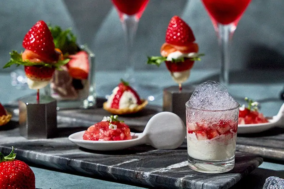 具体的には次の品目が含まれます:ストラッチャテッラといちごのベリーヌ、いちごとトマトと生ハムのタルタル、サーモンとストロベリーピンチョス、ブルーチーズといちごのタルトレット、ツナとベリーのサラダ。