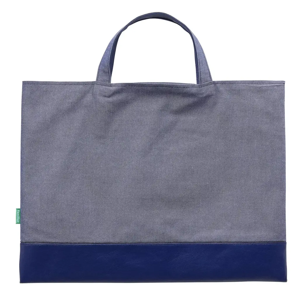 | デニムバッグ | 27,500円(税込)/本体 たて約32cm×よこ約43cm、持ち手全長約29.5cm/綿100%(表裏)、皮革部分 合成皮革/内側は白と青のストライプ生地 |