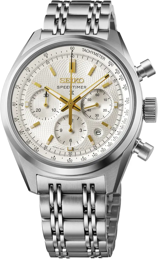 プロスペックスの限定モデルは、精緻な型打文様をホワイトダイヤルで表現し、ゴールドカラーが文様と響き合うことで視認性とデザインを両立しています。スピードタイマー メカニカルクロノグラフの特性を活かし、スポーツや日常での高い判読性と計測機能を保持しています。