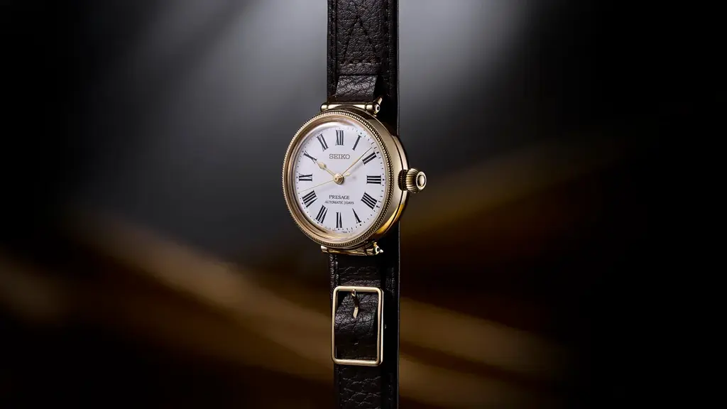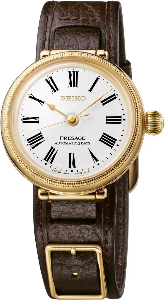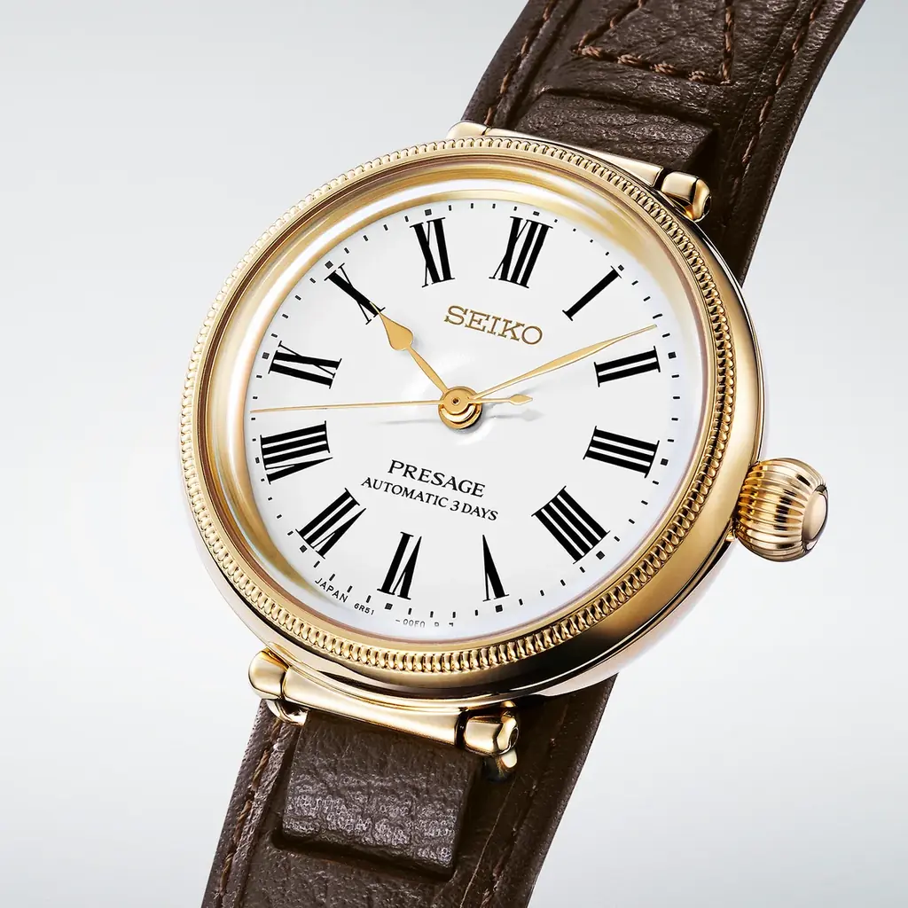 プレザージュは、精工舎の創成期に作られた懐中時計「タイムキーパー」をオマージュしたモデルです。ベゼルに立体的で緻密な装飾を施し、玉ねぎ形状のりゅうずやローマ数字インデックスの雰囲気を残しつつ、視認性の高い書体へとアップデートされています。琺瑯ダイヤルの艶やかな光沢とゴールドめっきのケースが、懐中時計的な温かみを演出します。