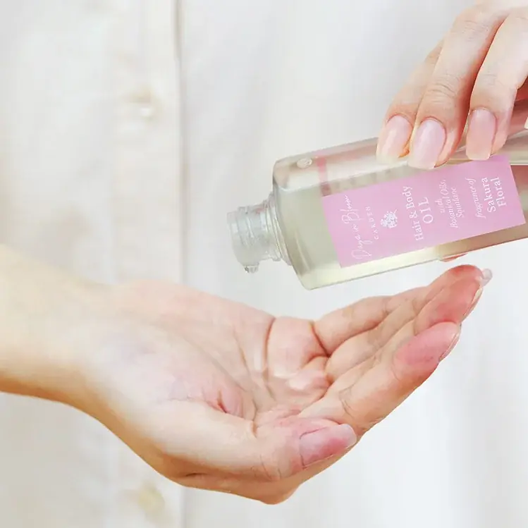 | ヘア&ボディーオイル(サクラフローラル) | 1,848円 | 100mL | 植物由来96% | スクワラン、ツバキ種子油、ホホバ種子油、ヒマワリ種子油、コメヌカ油、コメ胚芽油、ローズヒップオイル | 鉱物油・パラベン・アルコール・合成着色料・紫外線吸収剤・サルフェート不使用 | ノンシリコン、エコサステナブルパッケージ(バガス配合、FSC認証) |