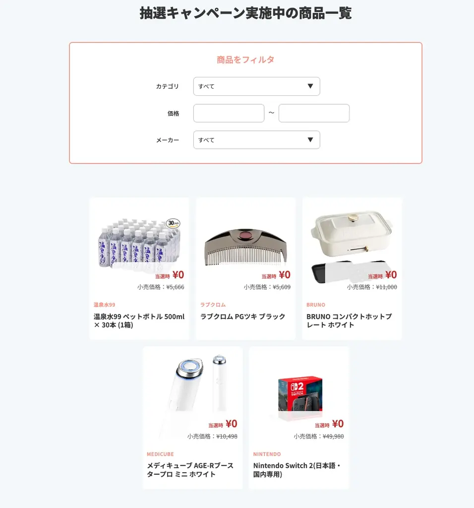 | 対象商品 | Nintendo Switch 2 / メディキューブ AGE-Rブースタープロ ミニ ホワイト / ラブクロム PGツキ ブラック / 温泉水99 500ml×30本 / BRUNO コンパクトホットプレート ホワイト |