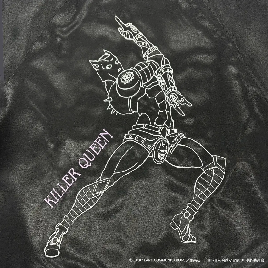 裏地は総柄プリントとなっており、刺繍・生地・裏地の組み合わせでスカジャンらしい存在感を出す仕様です。カラーはクロで、吉良吉影のスタンドである「キラークイーン」をモチーフとしています。