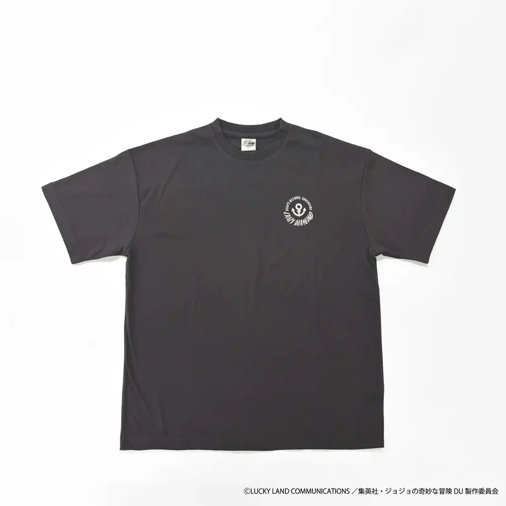 - 『クレイジー・ダイヤモンド』プリントTシャツ—カラー:チャコール。東方仗助のスタンド「クレイジー・ダイヤモンド」をモチーフ。バック大胆プリント、フロントはさりげないワンポイント。