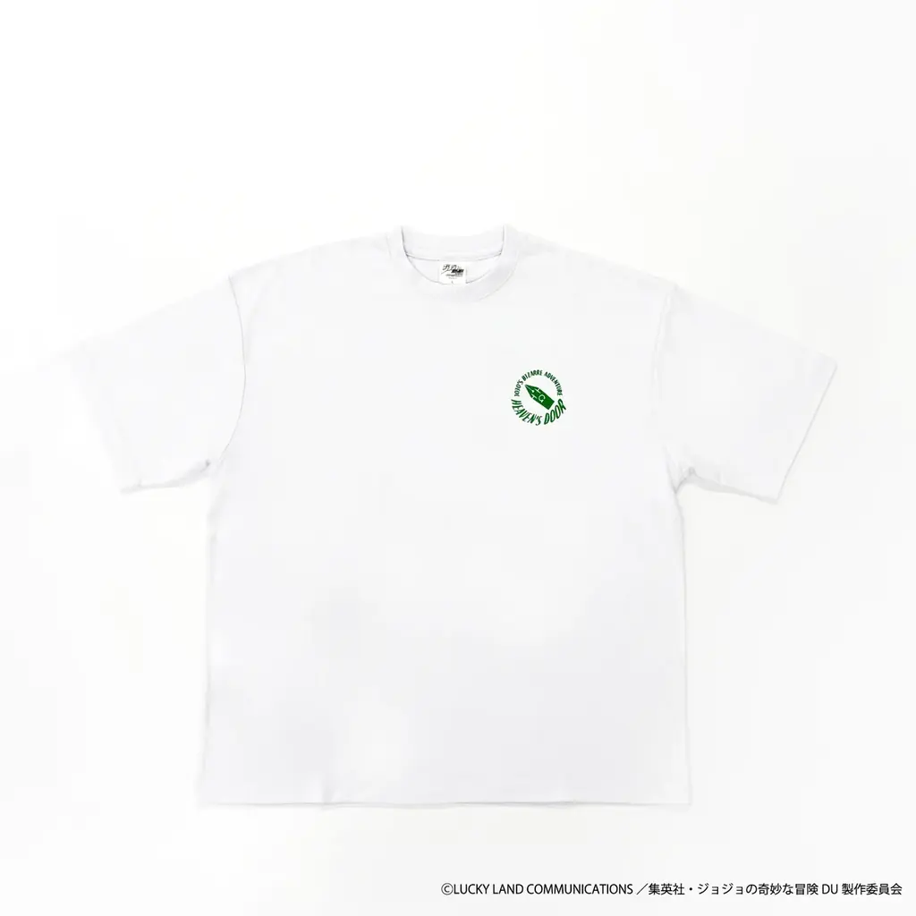 - 『ヘブンズ・ドアー』プリントTシャツ—カラー:シロ。岸辺露伴のスタンド「ヘブンズ・ドアー」をモチーフ。バック大胆プリント、フロントワンポイント。