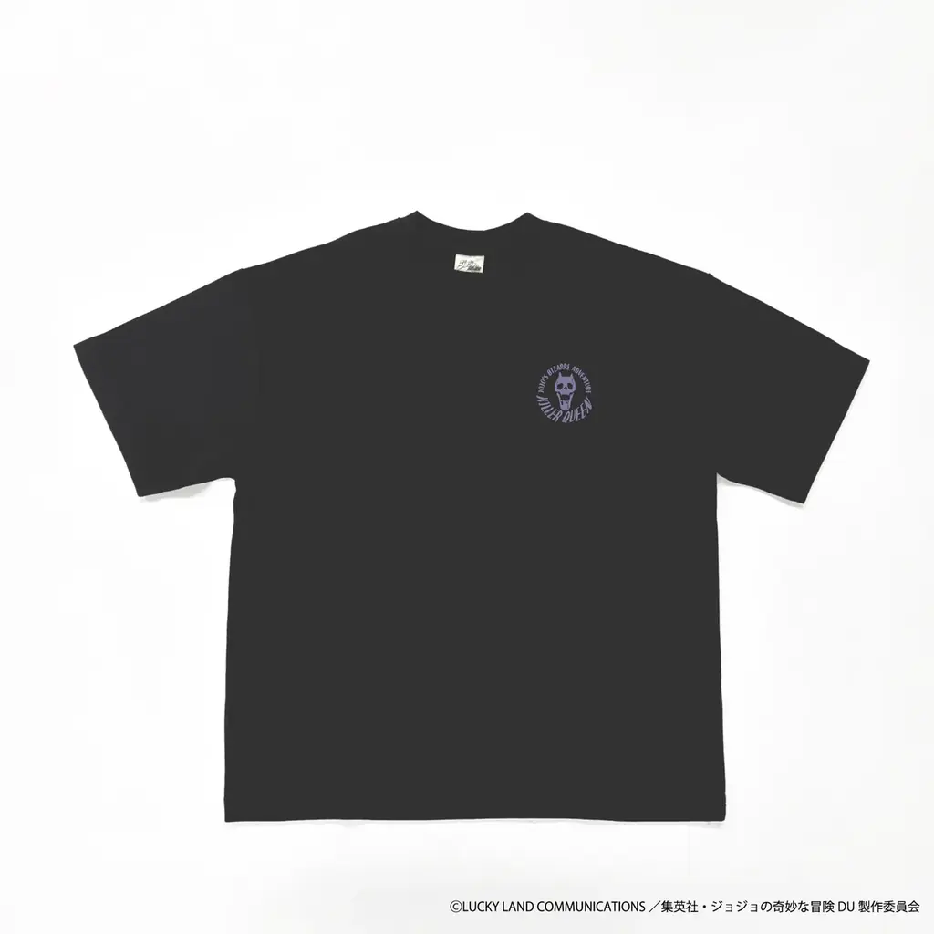 - 『キラークイーン』プリントTシャツ—カラー:クロ。吉良吉影のスタンド「キラークイーン」をモチーフ。バック大胆プリント、フロントワンポイント。