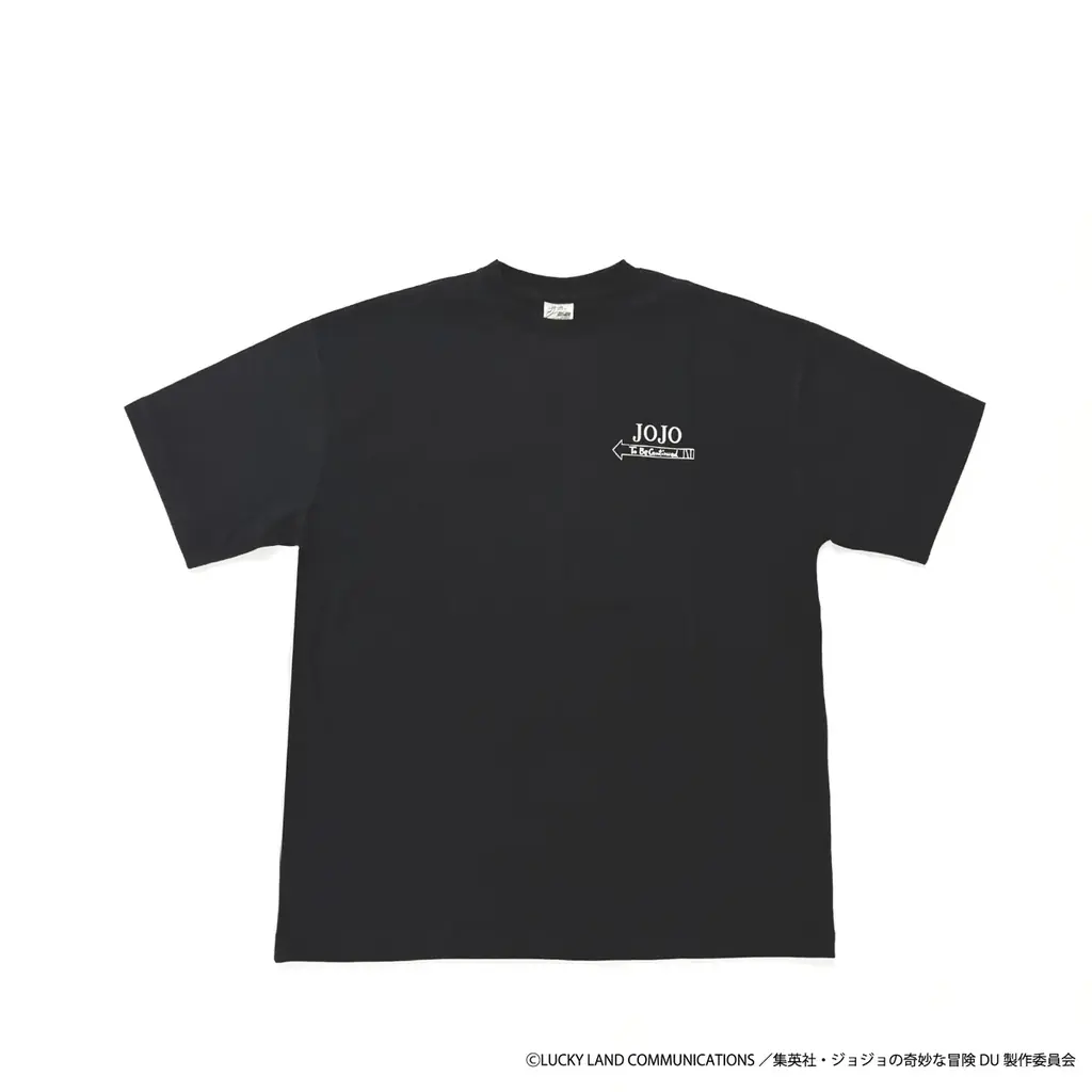 - 集合デザインのプリントTシャツ(2色展開)—カラー:クロ・シロ。仗助たちをデザインしたTシャツで、フロントはワンポイント、バックはヴィンテージ調のプリント。