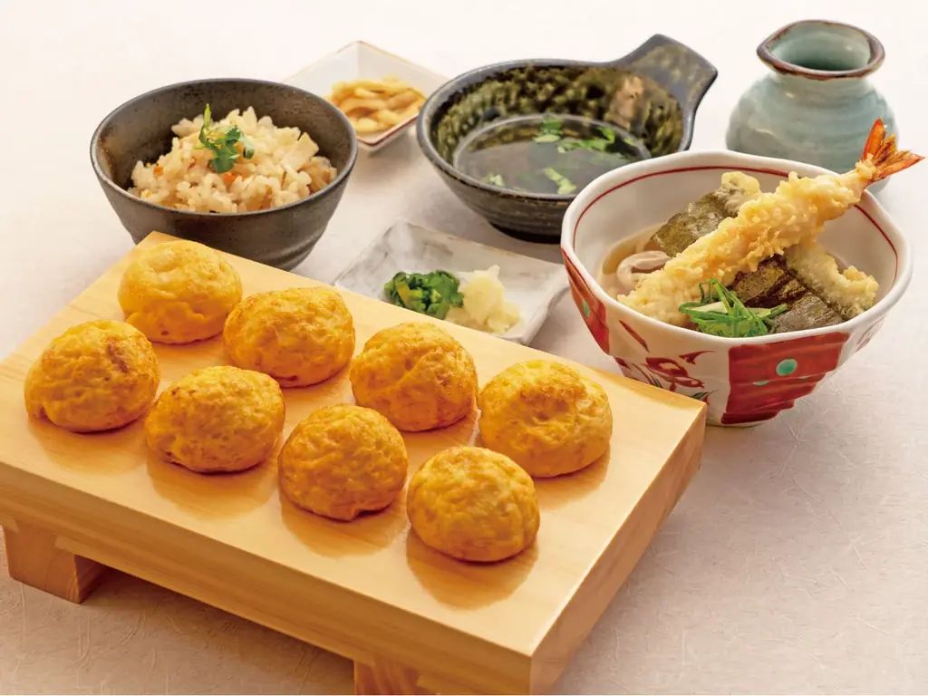 「玉子焼ひまわりセット」は、名物の玉子焼(明石焼)をはじめ、天ぷらうどん(またはそば)、季節の炊き込みご飯、お漬物が付く構成です。税抜価格は1,290円、税込価格は1,419円と明記されています。