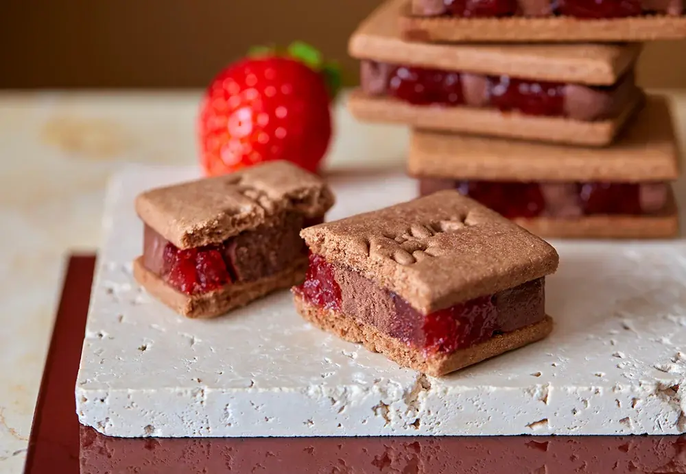 | ギフトスイーツ(冬限定) | いちごカカオサンド | イタリア産サブリナ苺のコンフィチュール+芳醇ショコラをしっとりクッキーでサンド | 4個入 1,296円(本体1,200円)/8個入 2,538円(本体2,350円) | 冬限定 |