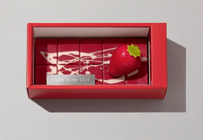 - 特徴:カダイフによるザクザク食感、甘酸っぱいラズベリーペースト、苺ミルク風味のとろけるソフトショコラ、トップにはあまおう苺ソースを中に秘めた赤い生ショコラケーキを配したレイヤードデザート