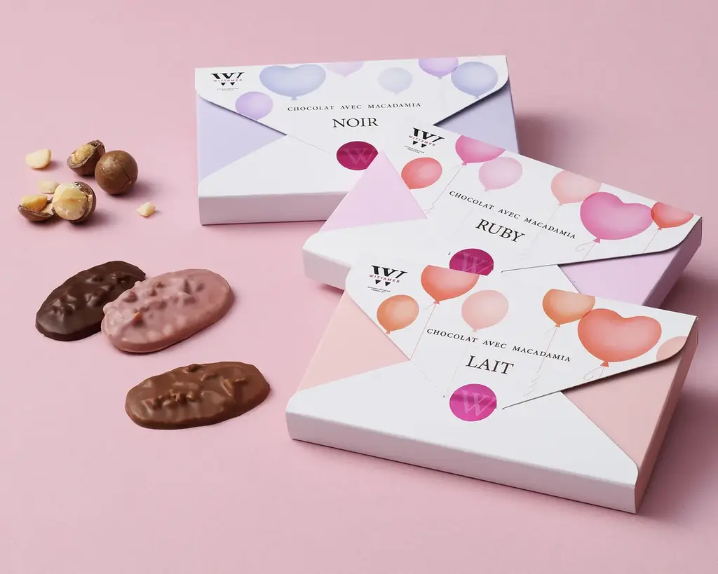 | マカダミア・ショコラ・レトル(各種) | 3枚入 各¥702(本体価格¥650)/販売期間:2026年1月10日(土)~2月14日(土)/フレーバー:ミルク、ダーク、ルビー |