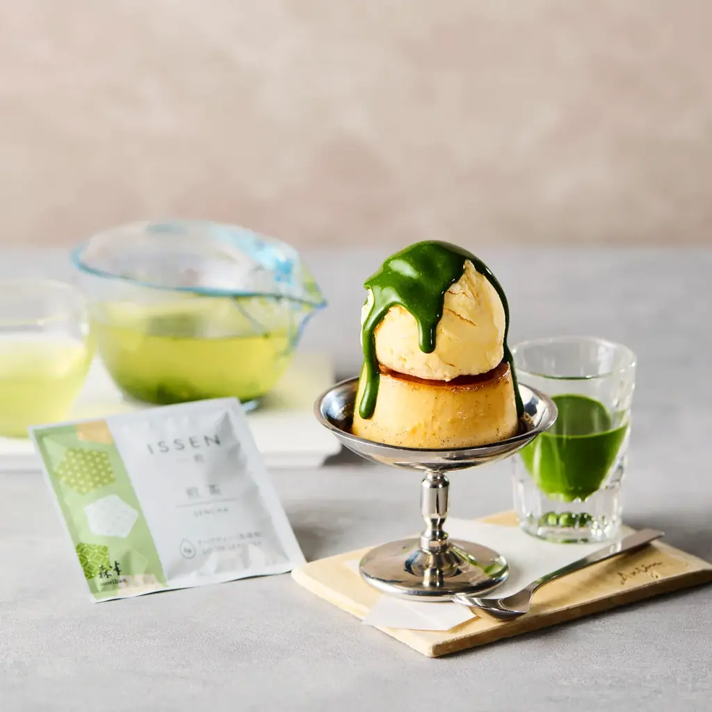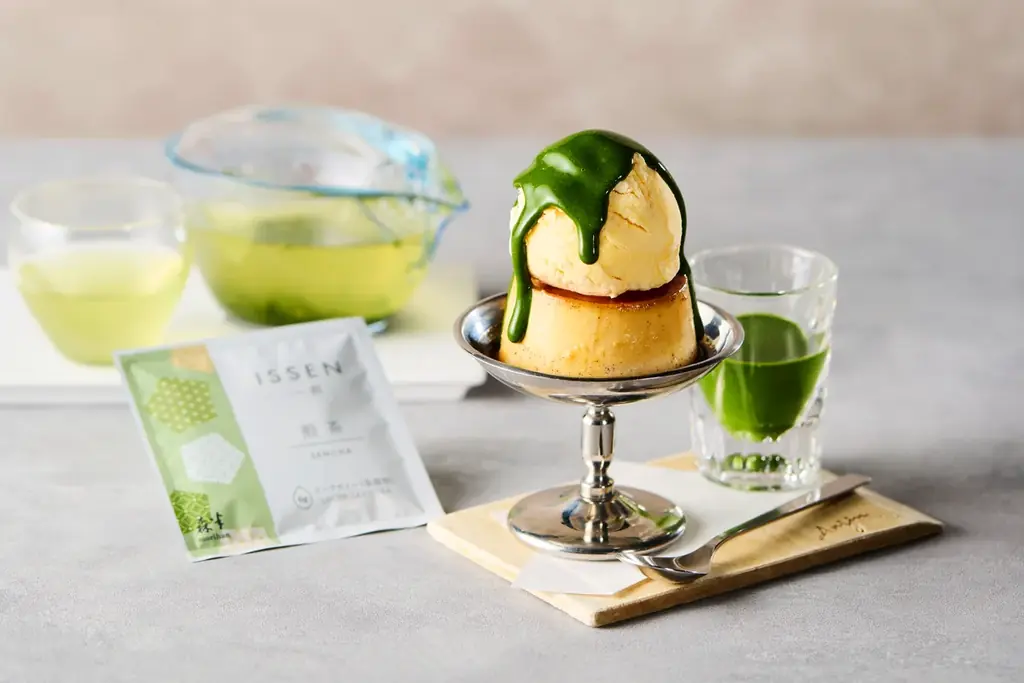 特別メニューではさらに、来店者がCHASTAを使って「ISSEN」の煎茶を自身で淹れる体験が含まれます。茶葉がゆっくりと開いていく様子や急須で淹れたお茶の香りや味わいを、Anjinプリンとともに楽しめる構成です。