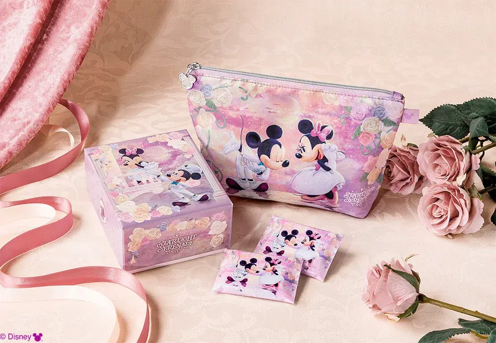 「スターライトセレナーデ」は、Disney SWEETS COLLECTION by 東京ばな奈の5周年を祝う描きおこしアートです。第2弾ではバラ色の星空をテーマに、ミッキーがミニーに星をあつめたハートを贈るシーンなど、永遠の恋人である2人のやり取りが印象的に表現されています。