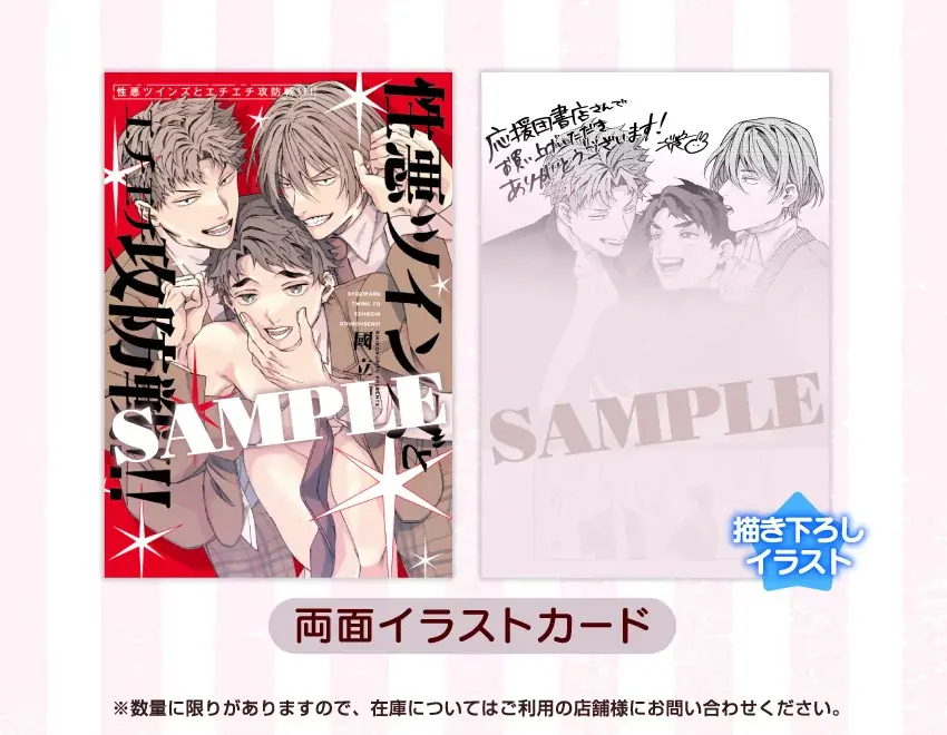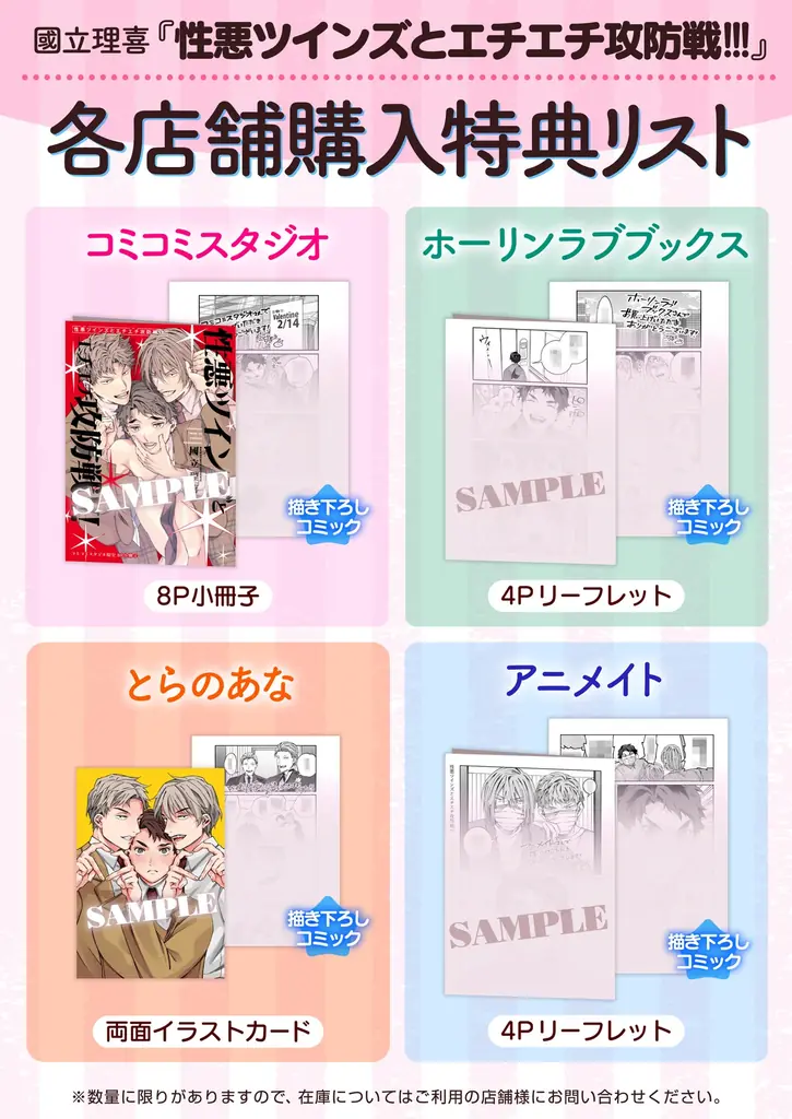 | 書店特典(紙) | ホーリンラブブックス:4Pリーフレット / コミコミスタジオ:8P小冊子 / とらのあな:両面イラストカード / アニメイト:4Pリーフレット |