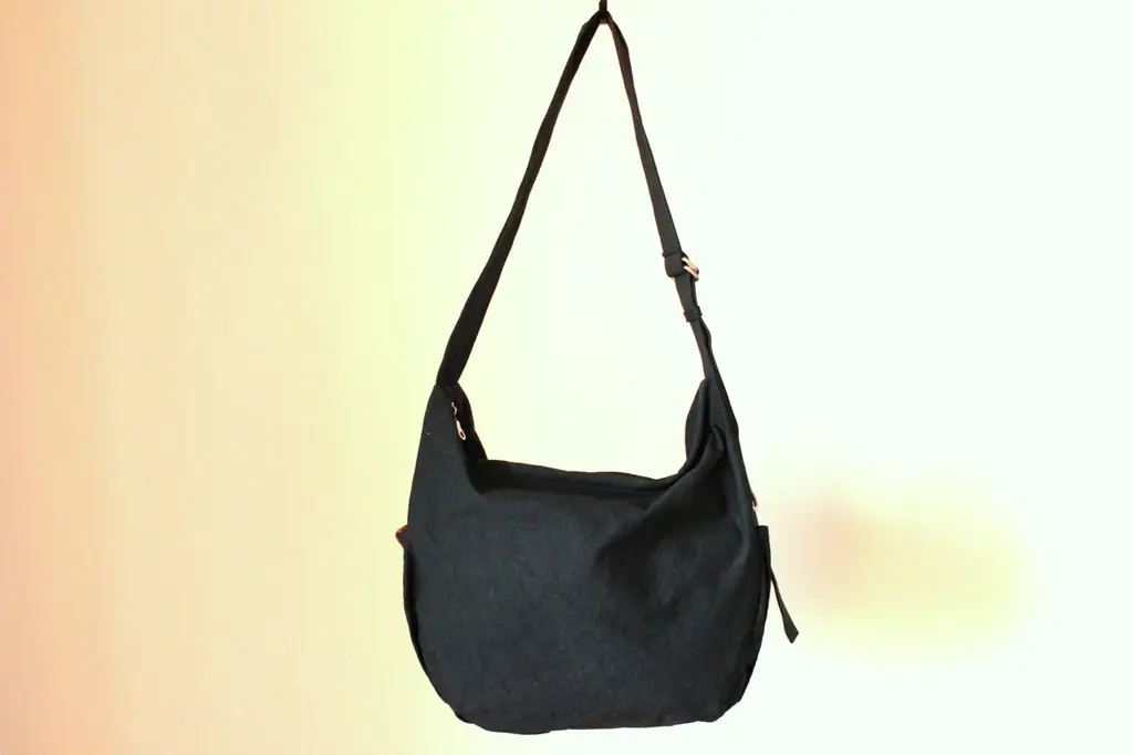 - 天日干し加工でCO2排出を抑えた生地「SUNNY DRY」を使用した日本製ショルダーバッグ。自然な風合いが特徴。