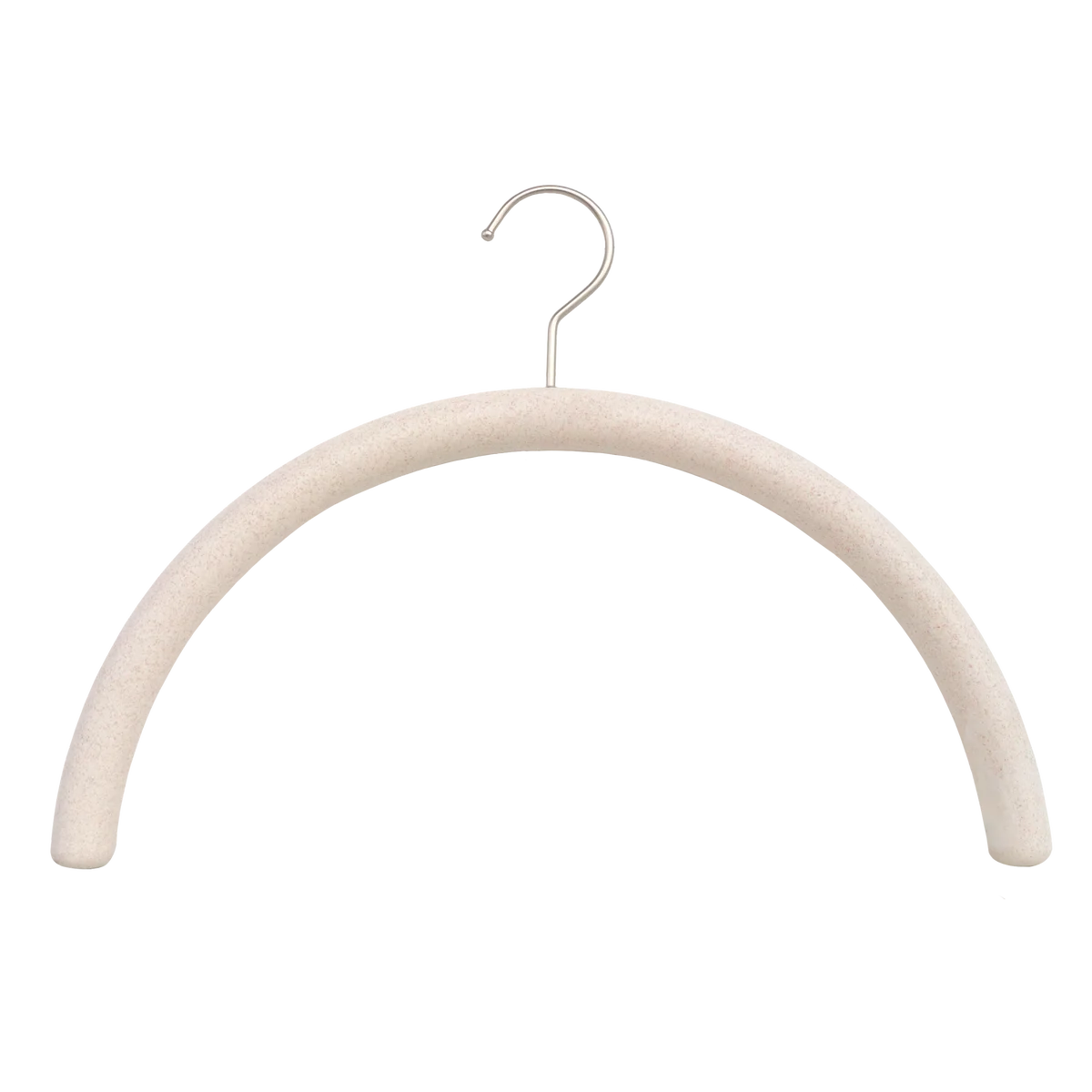 - お米のもみ殻を一部使用したバイオプラスチック製ハンガー。アーチ形状でニットやTシャツの型崩れを防ぐ。