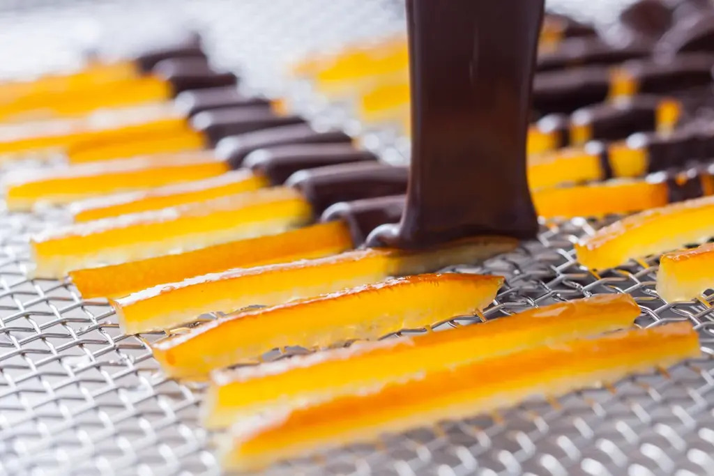 オレンジピールはフランスのサバトン社のノウハウによる煮込み・シロップ漬けで濃縮された製法により、照りがあり柔らかい食感が特徴です。細く棒状に加工しチョコレートがけする工程は高度な技術を要します。オレンジの渋みや雑味が抑えられ、甘さと香りのバランスが良いのが特長です。