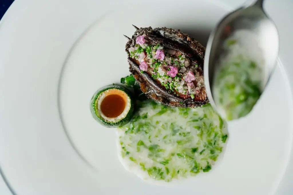 Menu de la Mer(14,300円・税込)は、蟹や平目、鮑などの旬の魚介が中心となるコースで、海の恵みが皿の中で多層的に表現されます。デザートまで続く海の物語をテーマに、各皿の香りと余韻が重視されています。