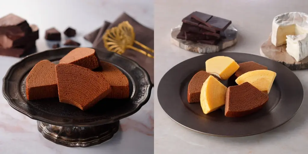 チーズバウムアソート(プレーン&ショコラ)は、従来のプレーンタイプのチーズバウム(カット)3個と、今回のショコラタイプ3個をセットにした詰め合わせです。個包装で配りやすく、さまざまなシーンで利用できる点が特徴です。