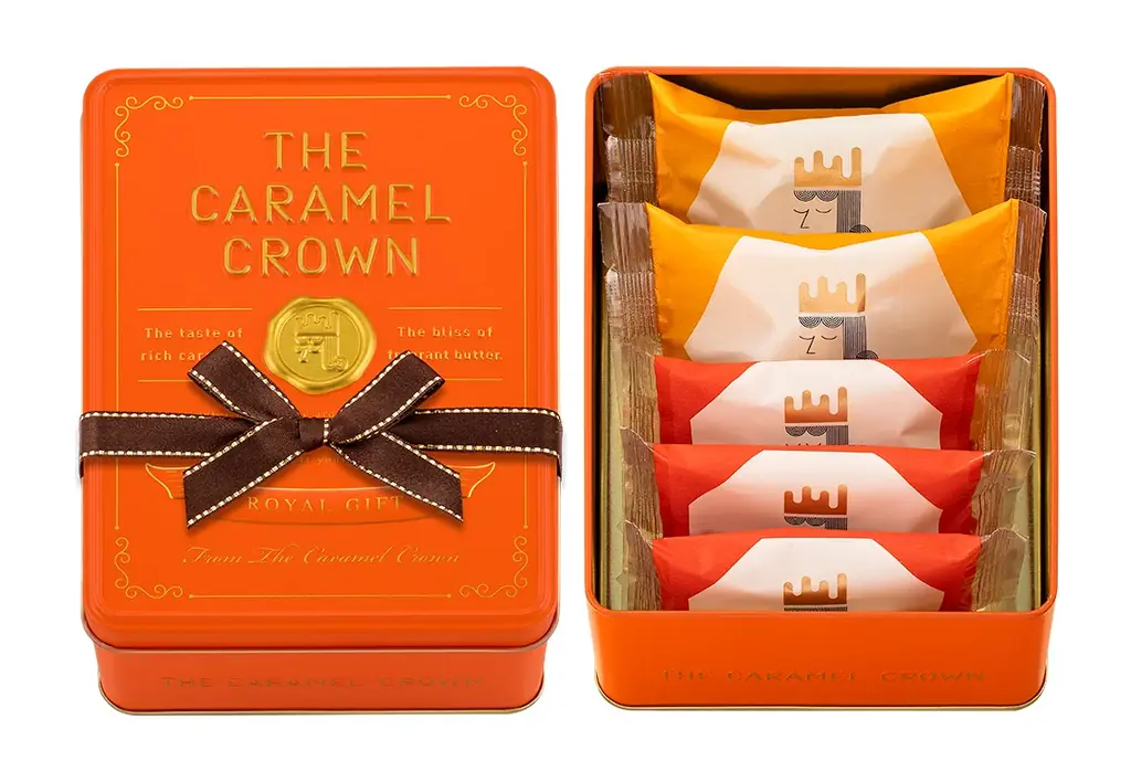 缶のデザインテーマは『キャラメル王室からの贈り物』。王冠や封蝋印を想起させる意匠により、贈り物としての体裁を重視したつくりになっています。大切な人へのギフトとして、また自分へのご褒美としても提案されています。